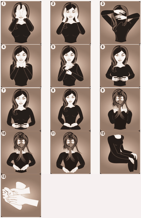 Now, begin the self Reiki process by placing your hands on various parts of your body. Hold each position for 2-5 minutes or as long as feels right. Here are the 13 suggested hand positions.